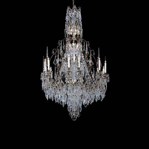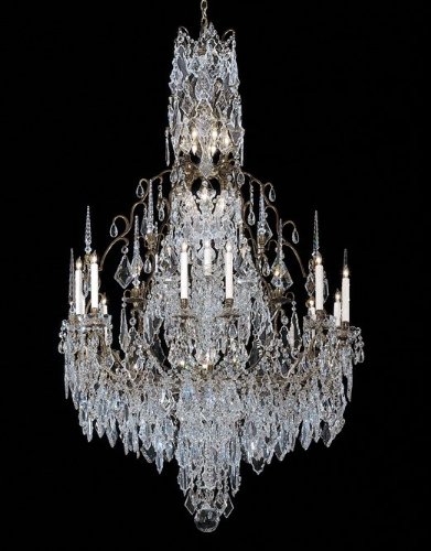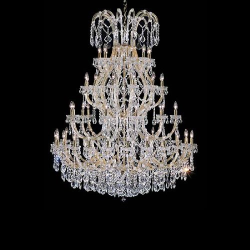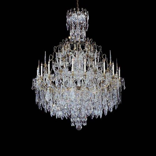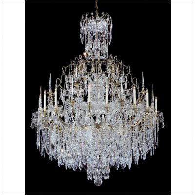 630-44-GO-01 Crystal Options: Strass, Finish: Gold Pictured in fume Solid Cast Brass Frame All metal elements of our frame are hand cast of solid brass. Every component of the frame is then meticulously hand finished through a laborious procedure of machining, sanding, and polishing, to ensure a smooth and highly reflective finish free of flaws. Cleverly concealed wire channels in each arm are all hand routed. We next apply one of our six durable metal finishes to the frame - rich dark bronze, 24k electroplated gold, electroplated nickel, fumed polished brass, volcano (an antique nickel with rich deep tones) or natural aged brass. All chandeliers include real hand-dipped beeswax candlesleeves. Each body dish, column and bobeche is individually hand-cut and polished on a wood wheel. Features: -44 Light chandelier. -Royale collection. -Available in: -Bronze finish. -Fume finish. -Gold finish. -Natural Brass finish. -Polished Nickel finish. -Volcano finish. . -Available in: -Czech style crystal. -French style crystal. -Strass crystal. Specifications: -Accommodates (44) 60W Candelabra base bulb. -UL and CSA certified. -Made in USA. -Overall dimensions: 76'' - 175'' H x 60'' W x 60'' D.